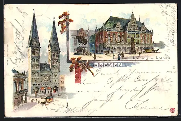 Lithographie Bremen, Dom mit Pferdebahn, Rathaus mit Roland