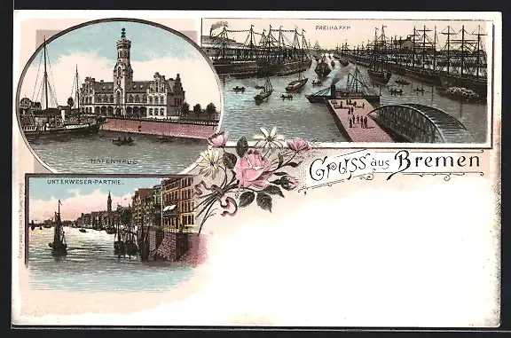 Lithographie Bremen, Freihafen, Hafenhaus, Unterweser Partie