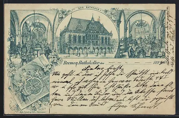 Lithographie Bremen, Gasthaus Rathskeller und das Rathaus