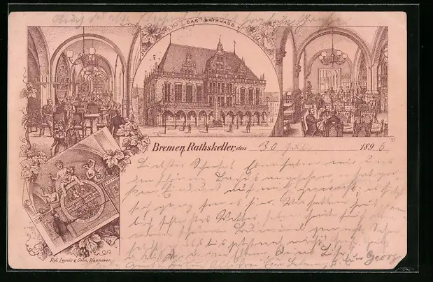 Lithographie Bremen, Gasthaus Ratskeller, Innenansichten, Rathaus