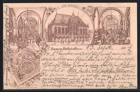 Lithographie Bremen, Gasthof Rathskeller und Rathaus