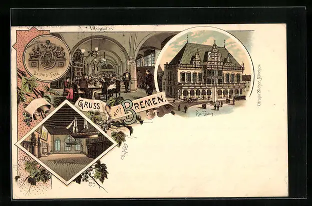 Lithographie Bremen, Gasthof Ratskeller, Rathaus, Innenansicht