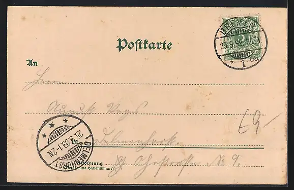 Personenbezogene Daten auf der Rückseite der Karte wurden durch blauen Textmarker unkenntlich gemacht. Die blauen Stellen sind auf die Vorderseite durchgeweicht und wirken sich negativ auf das Postkartenfoto aus