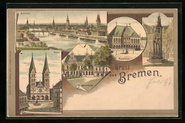 Lithographie Bremen, Gewerbehaus, Roland, Dom, Rathaus