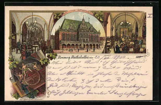 Lithographie Bremen, Innenansichten Gasthaus Ratskeller, Rathaus