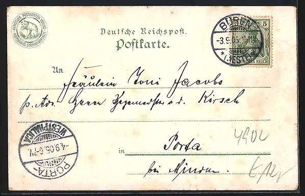 Personenbezogene Daten auf der Rückseite der Karte wurden durch blauen Textmarker unkenntlich gemacht. Die blauen Stellen sind auf die Vorderseite durchgeweicht und wirken sich negativ auf das Postkartenfoto aus