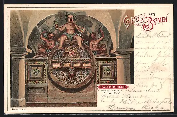 Lithographie Bremen, Ratskeller, Bachusfass