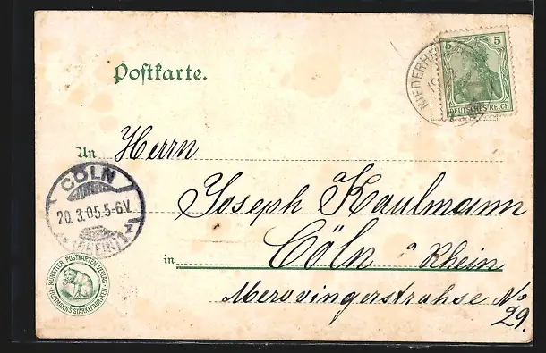 Personenbezogene Daten auf der Rückseite der Karte wurden durch blauen Textmarker unkenntlich gemacht. Die blauen Stellen sind auf die Vorderseite durchgeweicht und wirken sich negativ auf das Postkartenfoto aus
