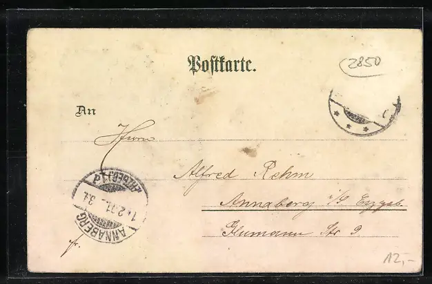 Personenbezogene Daten auf der Rückseite der Karte wurden durch blauen Textmarker unkenntlich gemacht. Die blauen Stellen sind auf die Vorderseite durchgeweicht und wirken sich negativ auf das Postkartenfoto aus
