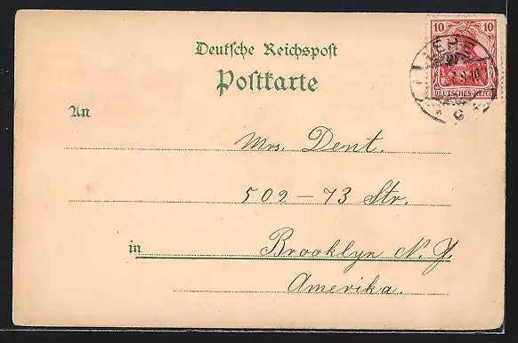 Personenbezogene Daten auf der Rückseite der Karte wurden durch blauen Textmarker unkenntlich gemacht. Die blauen Stellen sind auf die Vorderseite durchgeweicht und wirken sich negativ auf das Postkartenfoto aus