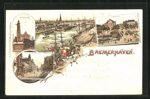 Lithographie Bremerhaven, Leuchtturm, Geestebrücke