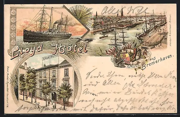 Lithographie Bremerhaven, Lloyd Hotel und Hafenpartie mit Segelschiffen