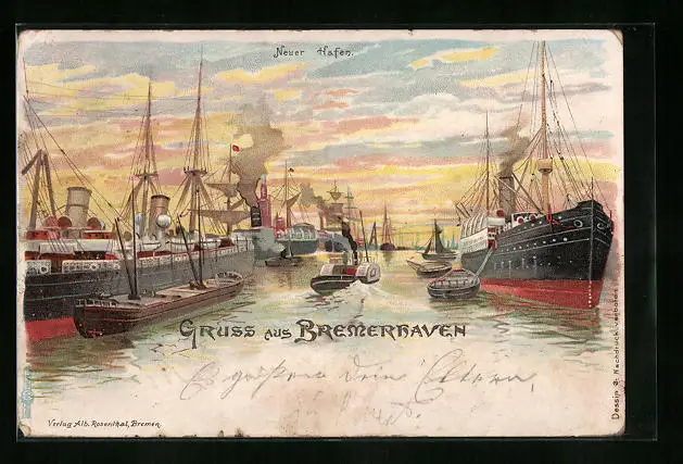 Lithographie Bremerhaven, Neuer Hafen mit Dampfschiffen und Raddampfer