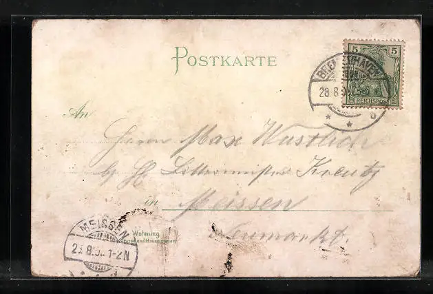 Personenbezogene Daten auf der Rückseite der Karte wurden durch blauen Textmarker unkenntlich gemacht. Die blauen Stellen sind auf die Vorderseite durchgeweicht und wirken sich negativ auf das Postkartenfoto aus