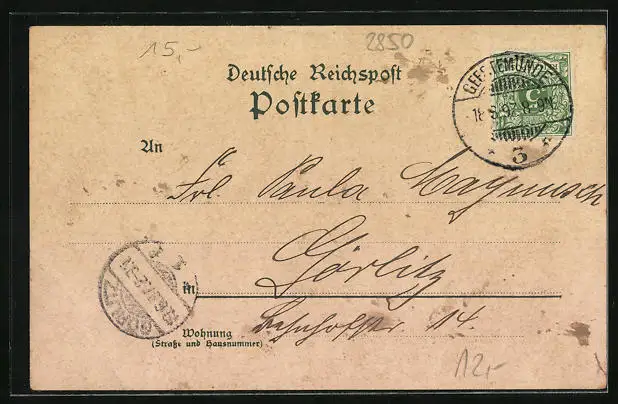 Personenbezogene Daten auf der Rückseite der Karte wurden durch blauen Textmarker unkenntlich gemacht. Die blauen Stellen sind auf die Vorderseite durchgeweicht und wirken sich negativ auf das Postkartenfoto aus