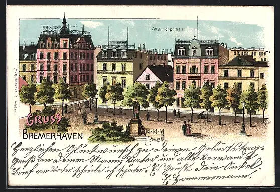 Lithographie Bremerhaven, Partie am Marktplatz mit Denkmal