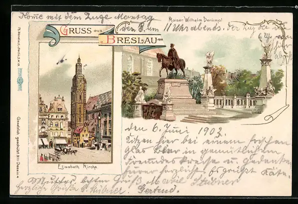 Lithographie Breslau, Elisabeth-Kirche, Kaiser Wilhelm-Denkmal