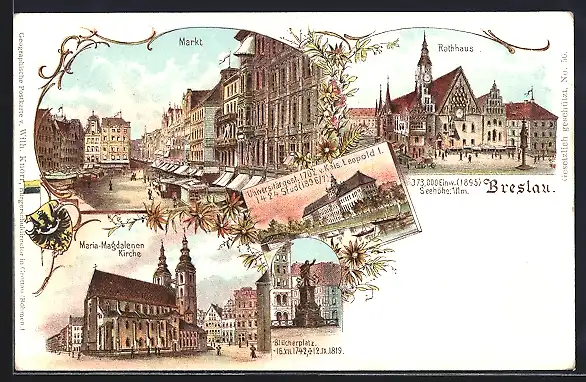 Lithographie Breslau, Markt, Rathaus, Maria-Magdalenenkirche