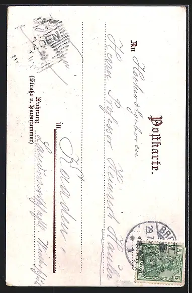 Personenbezogene Daten auf der Rückseite der Karte wurden durch blauen Textmarker unkenntlich gemacht. Die blauen Stellen sind auf die Vorderseite durchgeweicht und wirken sich negativ auf das Postkartenfoto aus