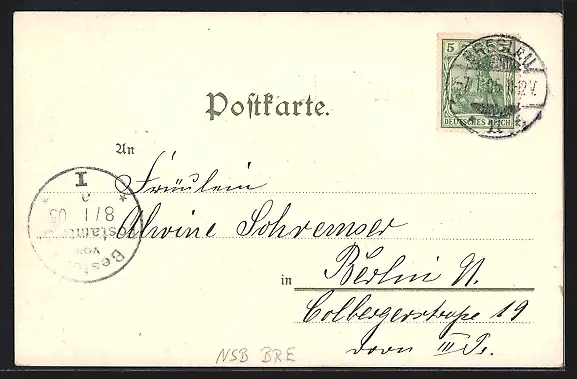 Personenbezogene Daten auf der Rückseite der Karte wurden durch blauen Textmarker unkenntlich gemacht. Die blauen Stellen sind auf die Vorderseite durchgeweicht und wirken sich negativ auf das Postkartenfoto aus