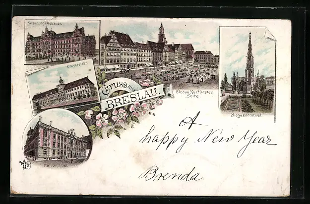 Lithographie Breslau, Regierungs-Gebäude, Kaiserliche Post, Universität