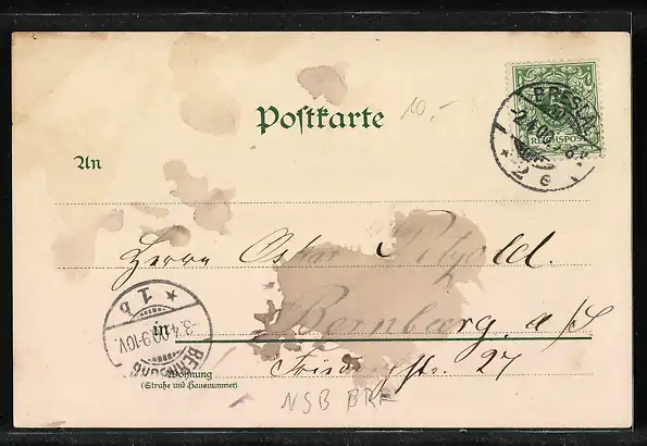 Personenbezogene Daten auf der Rückseite der Karte wurden durch blauen Textmarker unkenntlich gemacht. Die blauen Stellen sind auf die Vorderseite durchgeweicht und wirken sich negativ auf das Postkartenfoto aus