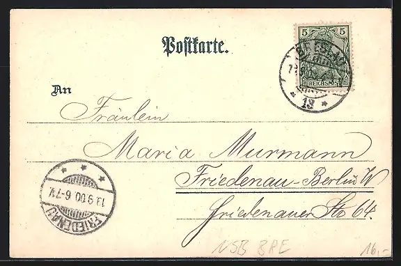 Personenbezogene Daten auf der Rückseite der Karte wurden durch blauen Textmarker unkenntlich gemacht. Die blauen Stellen sind auf die Vorderseite durchgeweicht und wirken sich negativ auf das Postkartenfoto aus