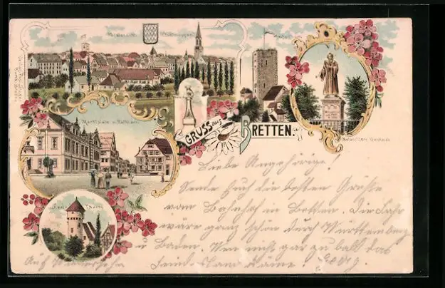 Lithographie Bretten, Marktplatz mit Rathaus, Melanchton-Denkmal, Pfeiferturm