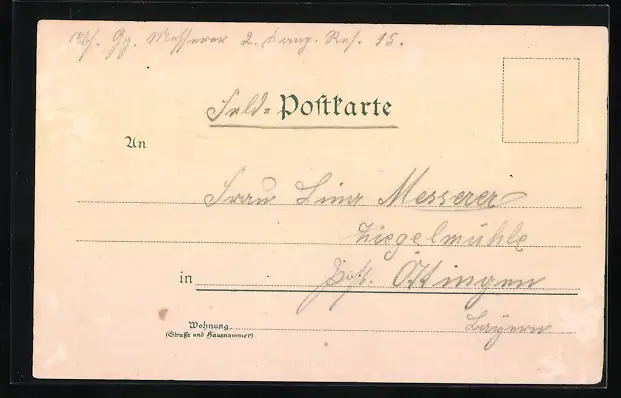 Personenbezogene Daten auf der Rückseite der Karte wurden durch blauen Textmarker unkenntlich gemacht. Die blauen Stellen sind auf die Vorderseite durchgeweicht und wirken sich negativ auf das Postkartenfoto aus