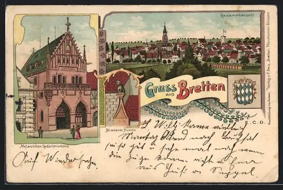 Lithographie Bretten, Melanchthon-Gedächtnishaus, Brettener Hundle, Gesamtansicht