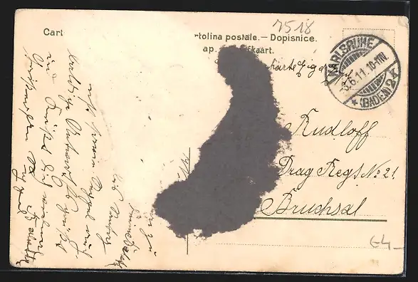 Personenbezogene Daten auf der Rückseite der Karte wurden durch blauen Textmarker unkenntlich gemacht. Die blauen Stellen sind auf die Vorderseite durchgeweicht und wirken sich negativ auf das Postkartenfoto aus