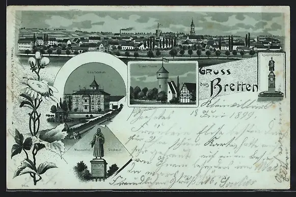 Lithographie Bretten, Simel-Thurm, Villa Schmidt, Melanchton-Denkmal