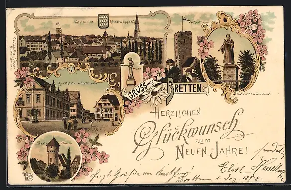 Lithographie Bretten, Simel-Turm, Pfeiferturm, Marktplatz mit Rathaus