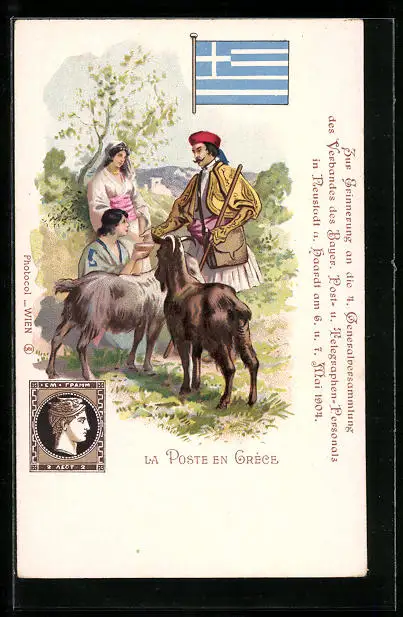 Lithographie Brief, Landesflagge, Griechenland, Postbote in Tracht mit zwei Ziegen