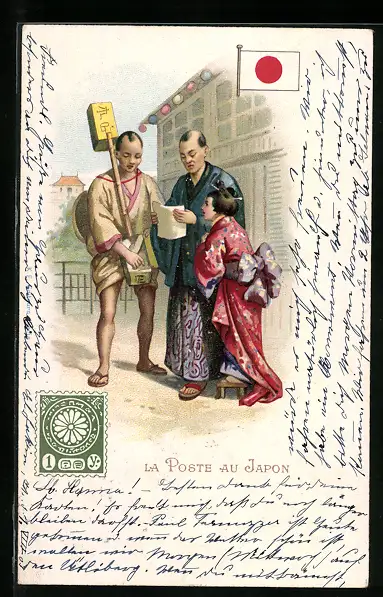 Lithographie Brief, Landesflagge, Japan, Postbote und Paar in Volkstrachten
