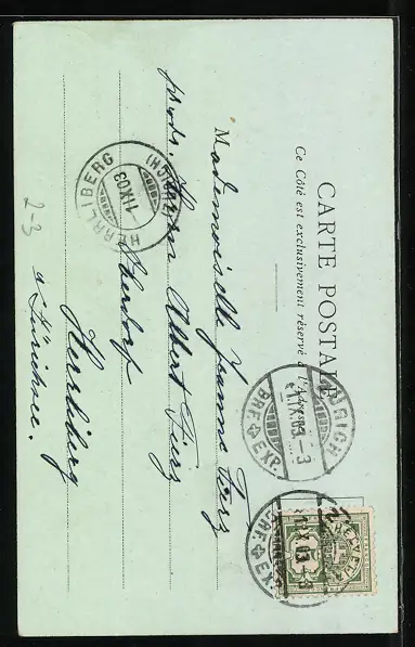 Personenbezogene Daten auf der Rückseite der Karte wurden durch blauen Textmarker unkenntlich gemacht. Die blauen Stellen sind auf die Vorderseite durchgeweicht und wirken sich negativ auf das Postkartenfoto aus