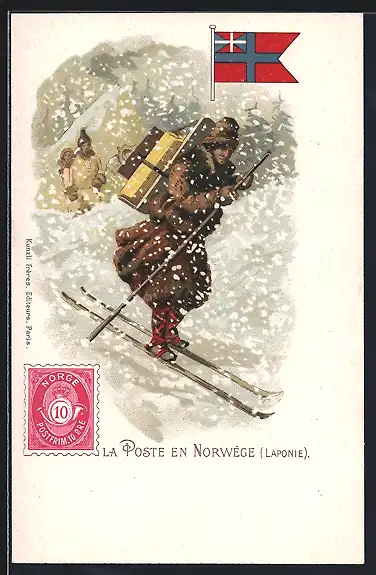 Lithographie Brief, Landesflagge, Norwegen, Postbote auf Skiern unterwegs