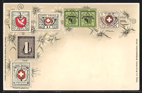 Lithographie Briefmarken der Stadtpost Basel, Zürich, Genf, Edelweiss