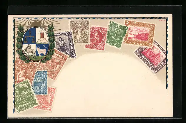 Lithographie Briefmarken von Uruguay und Wappen