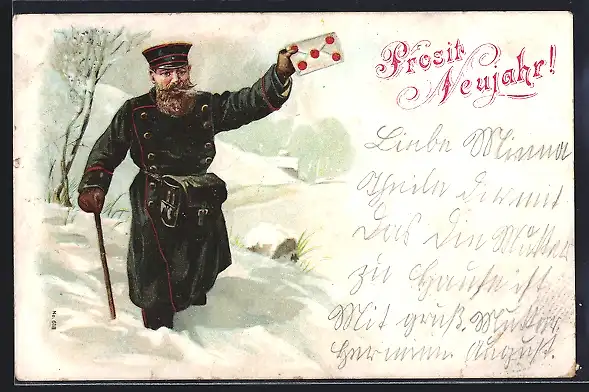 Lithographie Briefträger bringt Brief an verschneitem Tag