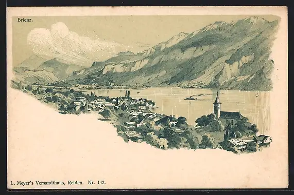 Lithographie Brienz, Ortsansicht mit Blick über den See