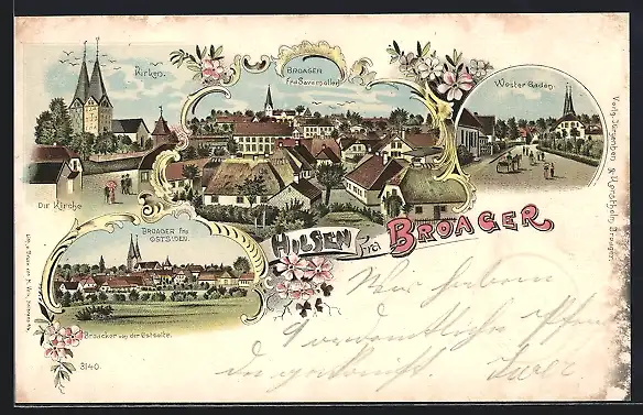 Lithographie Broager, Wester Gaden, Kirken, fra Savemollen