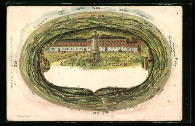 Lithographie Brocken, Bergansicht mit beiliegenden Orten