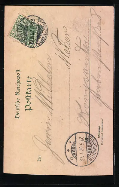 Personenbezogene Daten auf der Rückseite der Karte wurden durch blauen Textmarker unkenntlich gemacht. Die blauen Stellen sind auf die Vorderseite durchgeweicht und wirken sich negativ auf das Postkartenfoto aus