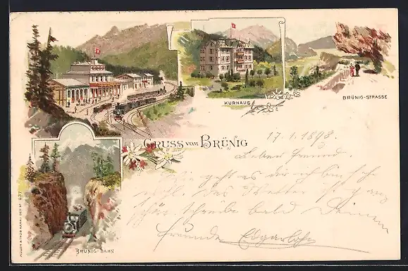 Lithographie Brünig, Bergbahn mit Brünig-Strasse