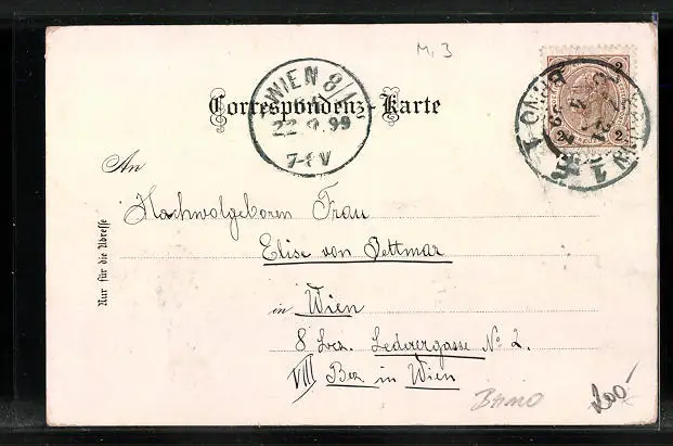gelaufen 1899, Stempelspur, Eckschaden re. oben, guter Zustand