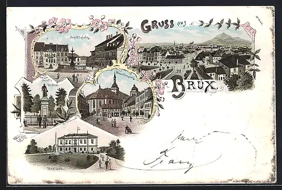 Lithographie Brüx / Most, Marktplatz, Minoritenplatz, Stadtbad