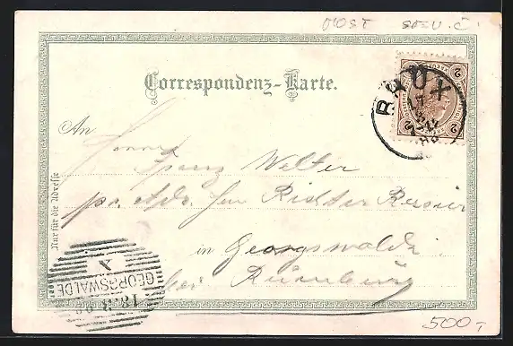 Personenbezogene Daten auf der Rückseite der Karte wurden durch blauen Textmarker unkenntlich gemacht. Die blauen Stellen sind auf die Vorderseite durchgeweicht und wirken sich negativ auf das Postkartenfoto aus
