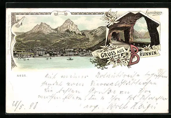Lithographie Brunnen, Partie an der Axenstrasse, Ortspanorama, Dampfer