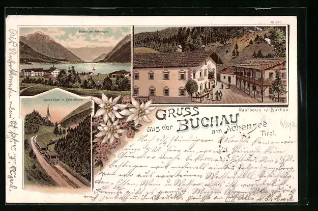Lithographie Buchau am Achensee, Gasthaus zur Buchau, Kirche Eben mit Zahnradbahn